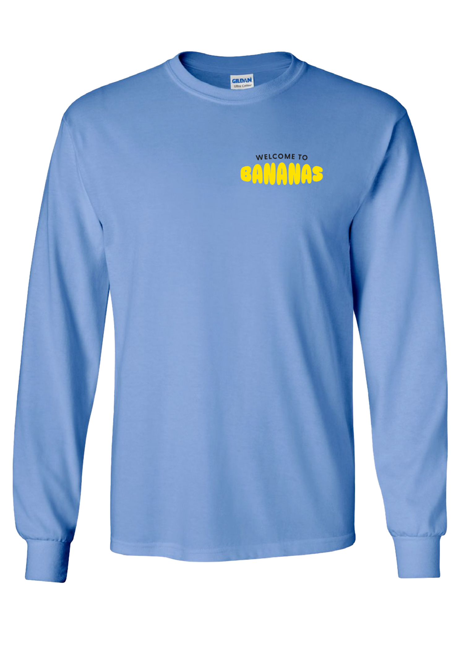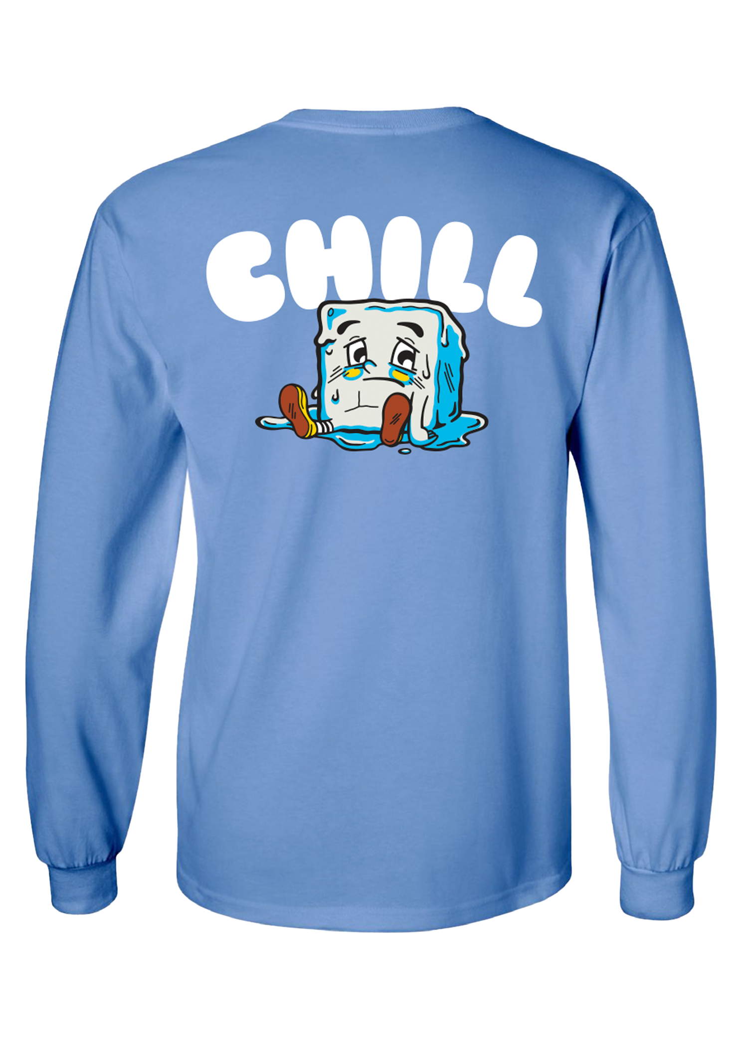 Light blue long sleeve with logo on front and ice cube character on back.
